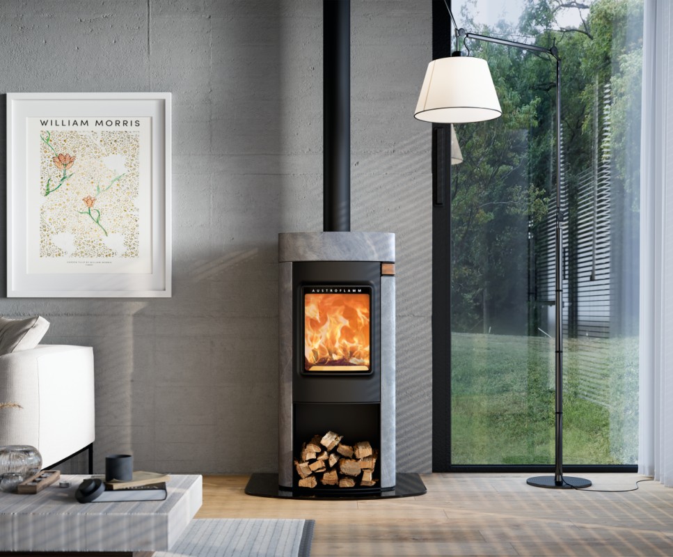 Met een natuursteenbekleding van 137 kg, verkrijgbaar in 3 verschillende kleuren, heeft Austroflamm hier een uitstekend ontwerpresultaat bereikt. Het innovatieve deurmechanisme – geen warme handgreep – maakt de berekening compleet.